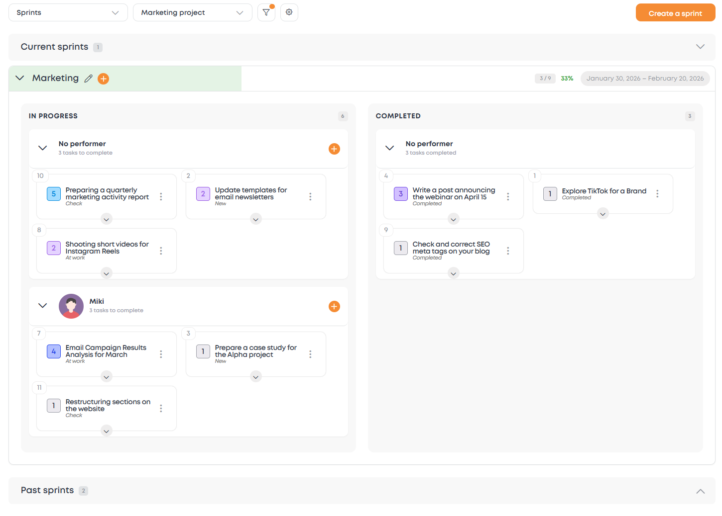 Register, create a project and the first sprint. Add tasks to the sprint, assign performers, and get started